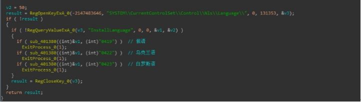 同许多泛俄语系勒索病毒一样——病毒会通过查询SYSTEM\CurrentControlSet\Control\Nls\Language注册表键值来检测当前操作系统的语言,若发现系统语言是俄语、乌克兰语或白罗斯语则不会继续加密。曾经名噪一时的Locky家族勒索病毒的代码中,也有类似的判断逻辑,我们有理由相信这是一种病毒作者对泛俄语地区用户的保护。