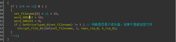 病毒遍历文件的过程中,还会判断当前盘符挂载的是否是只读光盘,若是,则不在对该磁盘进行加密操作。