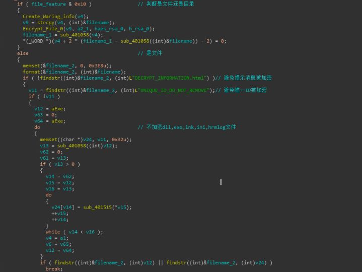 接下来,病毒会先判断正在扫描的目标是文件还是目录:若是一个目录就生成敲诈信,并进入该目录继续做递归扫描工作。若不是目录,再判断该文件是否是生成的敲诈信息或生成的唯一ID,均不是则继续检查文件的扩展名,若不是dll、exe、ini、lnk、hrmlog中的一个才会进行加密工作。