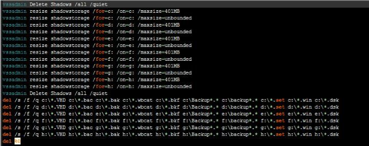 所有加密工作完成后,病毒还会进行一些其他的善后工作。首先是删除卷影副卷,以及删除后缀名为.vhd、.bak、.bac、.bkf、.wbcat以及文件名包含backup字符串类型的文件——因为这些文件都可能是备份文件。