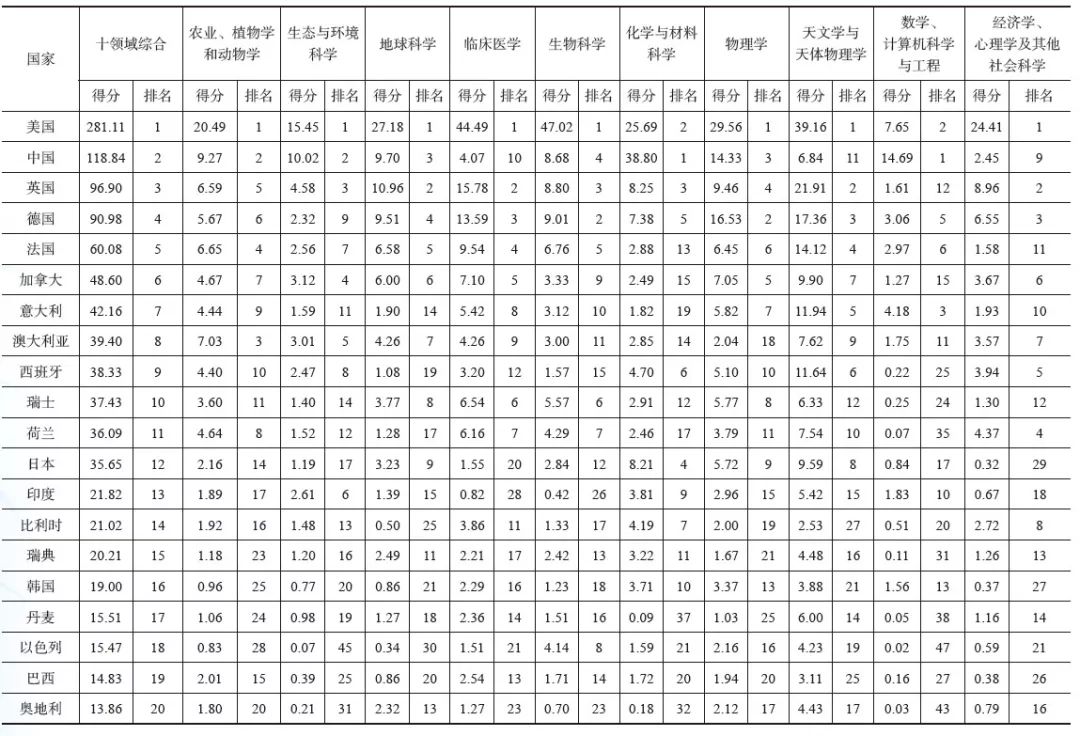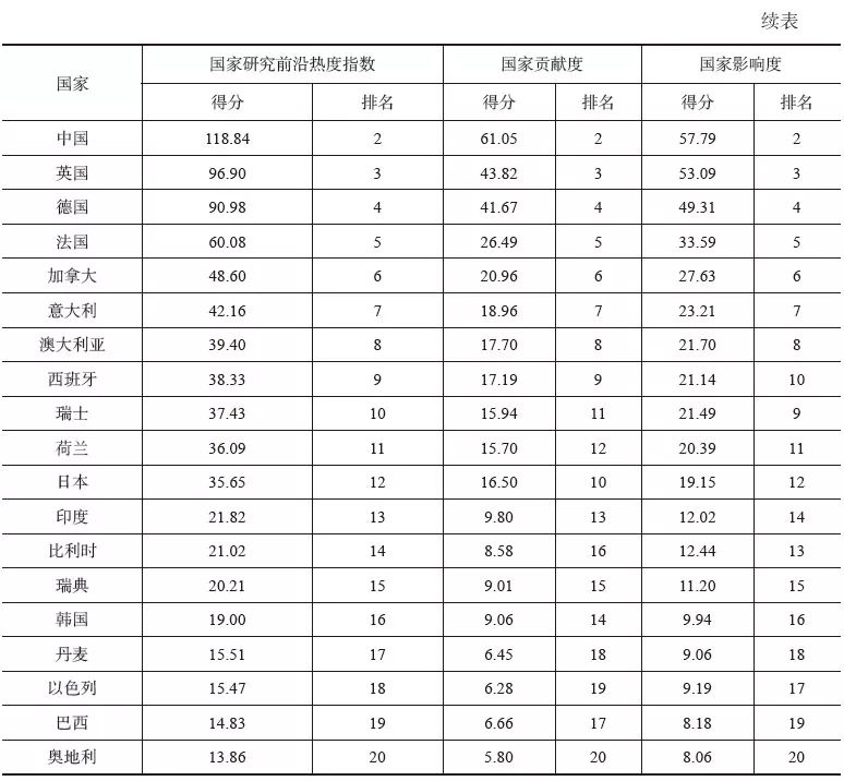 表1 十领域综合层面的Top20 国家研究前沿热度指数得分及排名