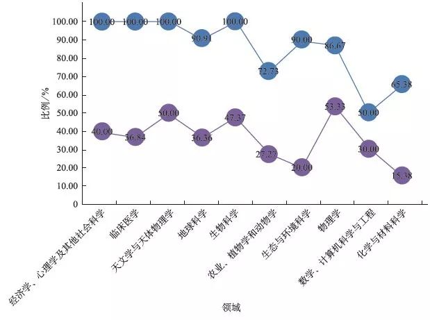 中国在化学与材料科学领域,以及数学、计算机科学与工程领域这两个领域表现最活跃,这两个领域排名前三的研究前沿均占到80% 及以上。
