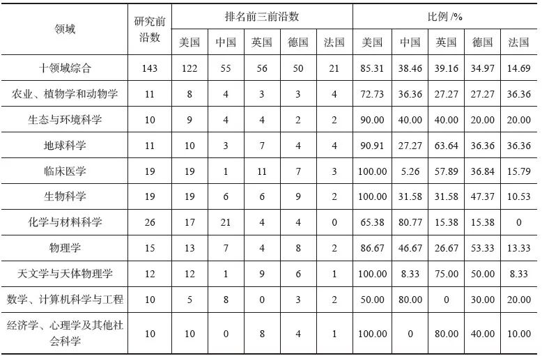 英国在地球科学领域、临床医学领域、天文学与天体物理学领域和经济学、心理学及其他社会科学领域等4 个领域均有接近60% 或60% 以上的前沿排名前三,这4 个领域是英国的优势领域。