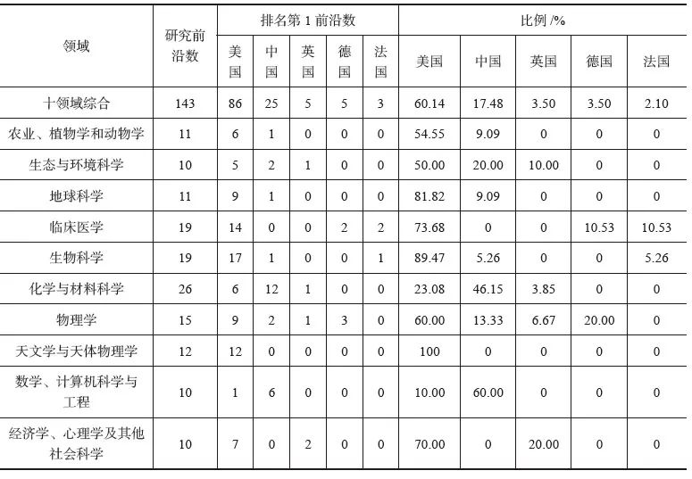 分领域来看,美国在8 个领域排名前三的前沿占比均在70%~100%,在化学与材料科学领域也占到了约65.38%,在数学、计算机科学与工程领域排名前三的前沿比例最低,为50.00%。