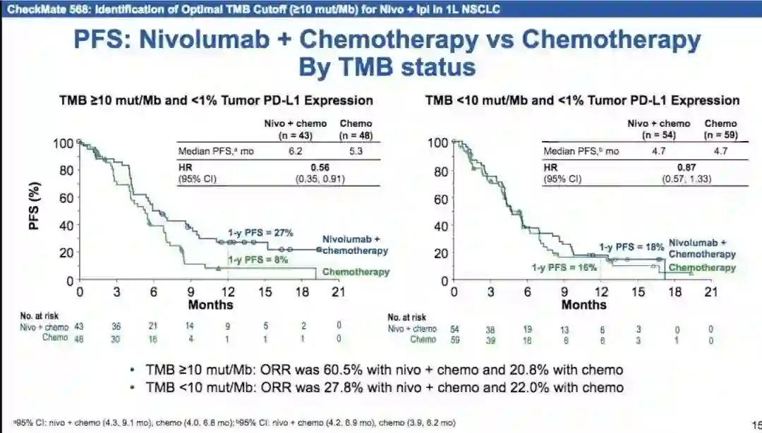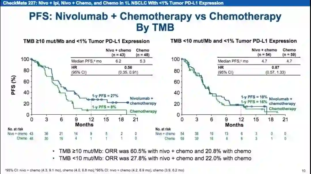 在这个研究中,还有一个最大的亮点是基于TMB分析,提供了IO 联合IO对比IO联合化疗在疗效方面比较的线索。我们来看CheckMate 227研究基于TMB分层的生存数据分析。同样是PD-L1<1%,在TMB< 10 mut/Mb亚组中,纳武利尤单抗联合化疗与单纯化疗组在ORR、PFS上均无统计学差异;但在TMB³ 10 mut/Mb亚组人群中,纳武利尤单抗联合化疗组的ORR达60.5%, 中位PFS达6.2个月,显著长于单纯化疗组。提示,TMB可能也可以作为IO联合化疗进行人群筛选的biomarker。