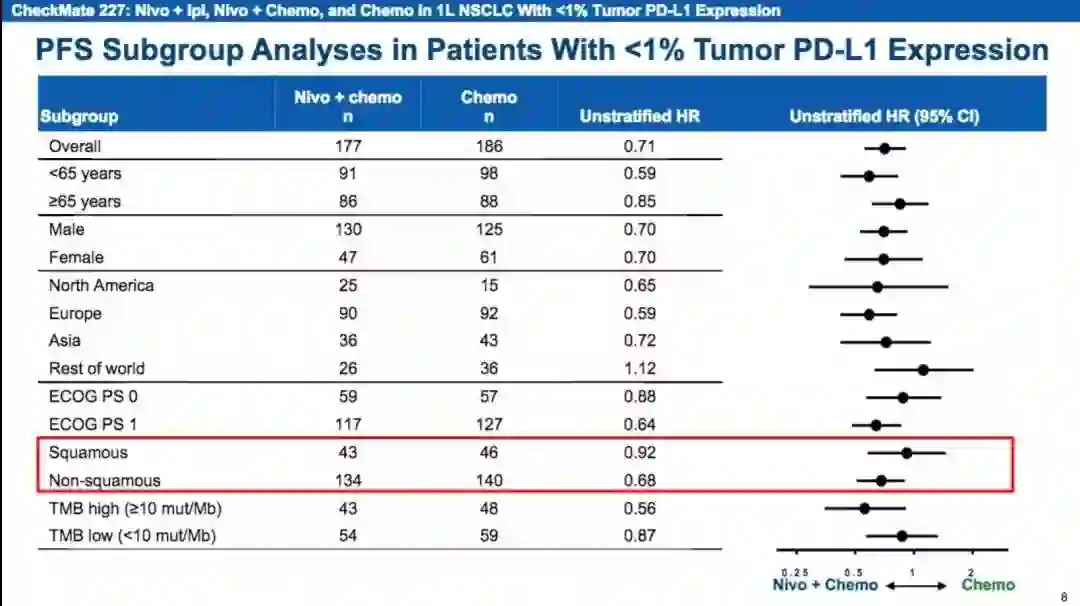 nivo+chemo治疗的各亚组也均观察到PFS的延长。尤其在以组织学分层的亚组中,接受nivo+chemo治疗非鳞癌患者的HR=0.68,而鳞癌患者的HR=0.92。