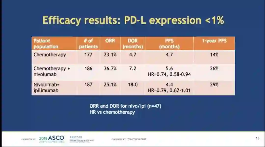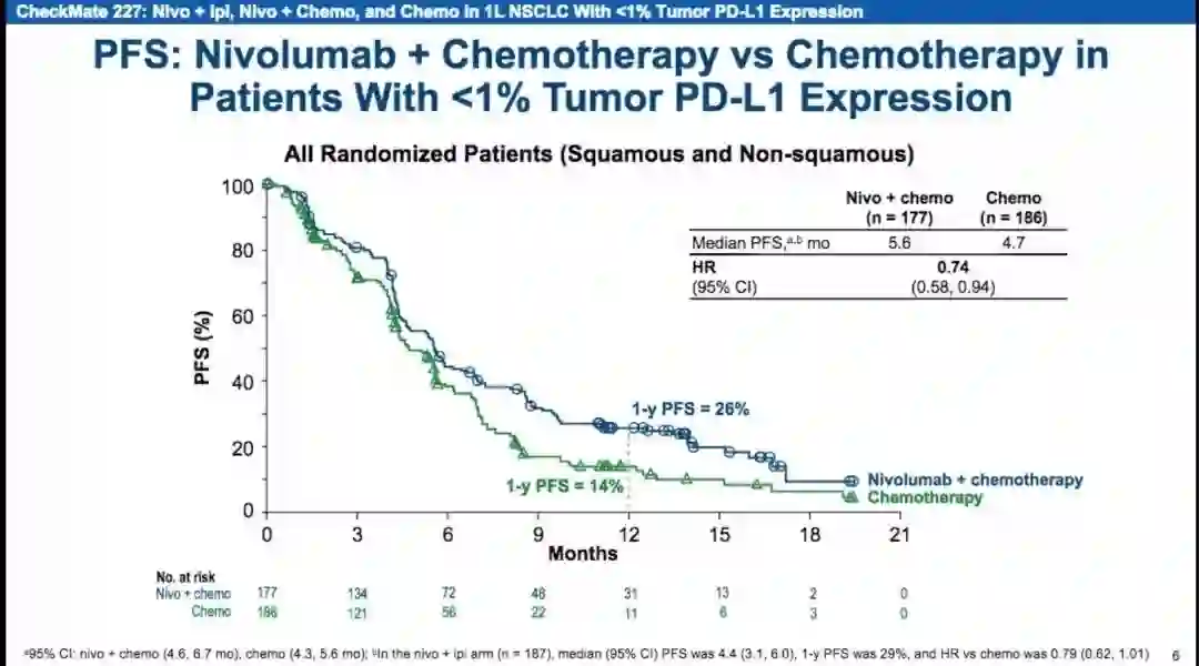 Nivolumab+含铂化疗对比化疗在PD-L1表达<1%晚期NSCLC一线治疗结果-CheckMate 227 (ABS 9001)