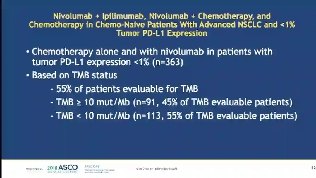 研究的1b部分,患者按照1:1:1随机分为三组:nivolumab (3mg/kg每两周给药)联合低剂量ipilimumab(1 mg/kg,每6周给药)组(n=187);nivolumab (360mg每三周给药)联合基于组织学类型选择的含铂双药化疗,加nivolumab单药维持治疗组(n=177);基于组织学类型选择的含铂双药化疗组(每3周,总共不超过4个周期,n=186)。在研究中使用经过验证的FoundationOne CDx检测TMB。