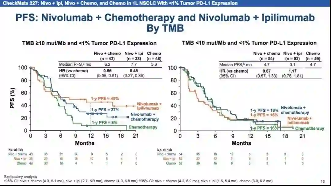 数据显示,在PD-L1 <1%患者中,与化疗(n=186)相比,nivolumab联合化疗(n=177)能够延长无进展生存期(PFS, HR 0.74; 95% CI: 0.58 - 0.94)。PFS是该研究第 1b部分nivolumab联合化疗的次要研究终点,结果基于描述性分析。在对高肿瘤突变负荷(TMB≥10个突变/Mb)且PD-L1 <1%的患者进行探索性分析时,nivolumab联合低剂量ipilimumab组(n=38)的一年PFS率为45%,nivolumab联合化疗组(n=43)为27%,化疗组(n=48)为8%。在低肿瘤突变负荷(TMB <10 个突变/Mb)且PD-L1<1%的患者中, nivolumab联合低剂量ipilimumab组(n=52)和nivolumab联合化疗组(n=54)的一年PFS率均为18%,化疗组(n=59)为16%。