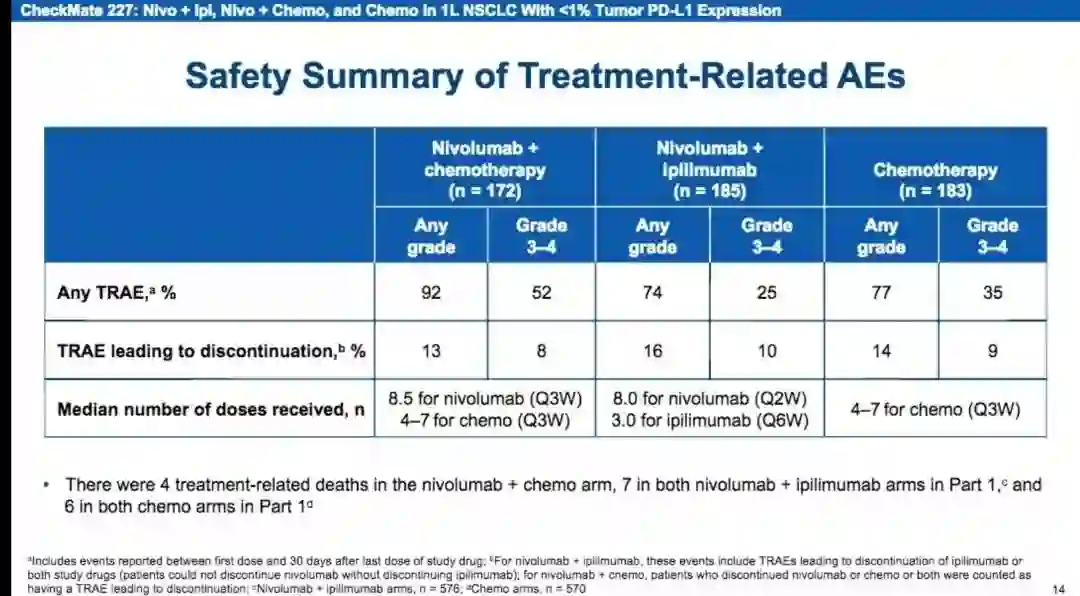 由于任何相关不良事件引起的终止治疗比例在nivo+chemo组和chemo组分别为13%和14%。