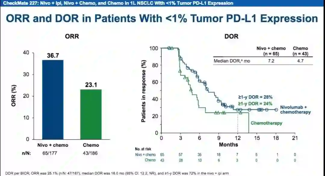 首先来看3组的疗效总结。与化疗组相比,纳武利尤单抗联合化疗组的ORR、DOR、PFS以及1年无疾病进展生存率较有优势。虽然纳武利尤单抗联合伊匹木单抗的ORR为25.1%,但是DOR长达18.0个月,PFS为4.4个月,1年无疾病进展生存率为29%。