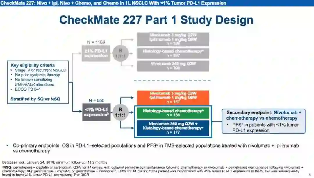 CheckMate-227是一项开放性III期临床研究,评估了基于nivolumab的治疗方案与含铂双药化疗用于晚期非小细胞肺癌(NSCLC)患者(包括鳞癌和非鳞癌患者)一线治疗的疗效和安全性。该研究共分为下列3个部分:
