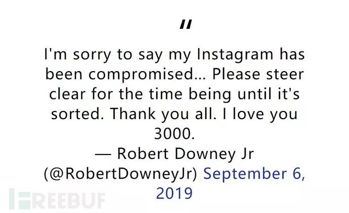 近日,Robert Downey Jr.的Instagram 账号遭到黑客入侵。所幸黑客并没有发布什么具有攻击性的信息,只是企图利用苹果手机虚假赠品以引诱粉丝点击来获利。