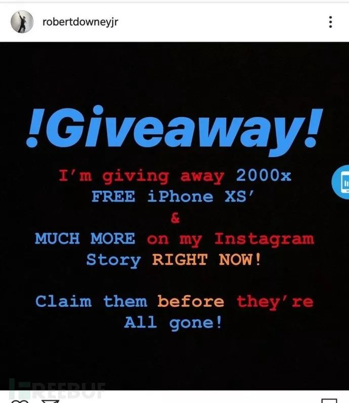 目前还不清楚黑客如何入侵Robert Downey Jr.的Instagram,黑客只是在他的账号上发布消息说,Robert Downey Jr.将赠送2000部iPhone XS设备,并吸引粉丝进入他的账号主页,以获得更多这样的优惠。