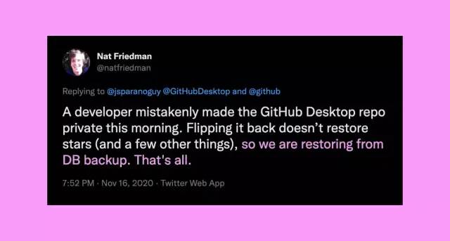以下是 GitHub前CEO对情况的解释:早上有开发人员误操作了。权限改回来是无法直接回复项目评星的,所以开发者们用数据备份整个完全还原了项目,就这样。