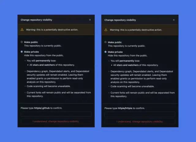 在涉及到档案文件和托管项目的时候,GitHub的概念模型会把所有的用户和组织都视为相似的实体。所以说,当开发者只是想简简单单的隐藏文档的时候,他不多注意时就很容易点击错到「私密」按钮。