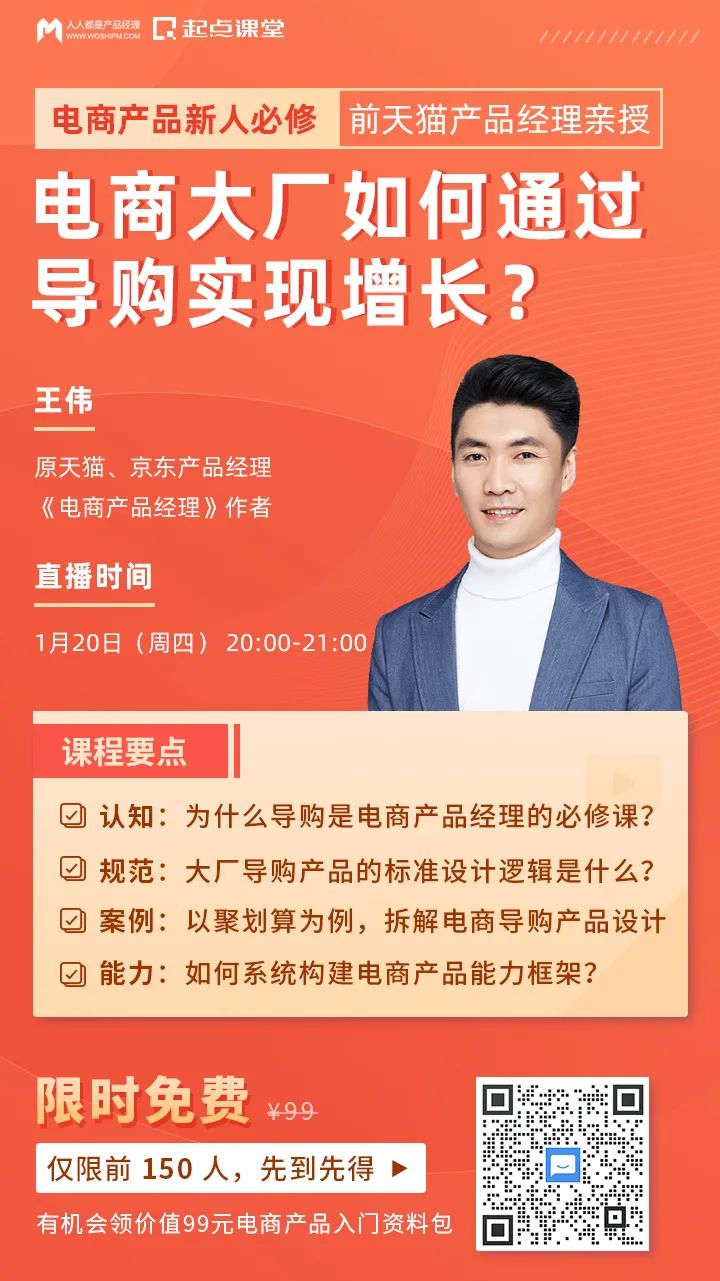 为了解决这些问题,帮助0-3岁电商产品经理可以更快入门成长,1月20日(周四)晚8点,人人都是产品经理&起点课堂邀请前天猫/京东产品经理、畅销书《电商产品经理》作者王伟老师,准备了这次直播公开课。