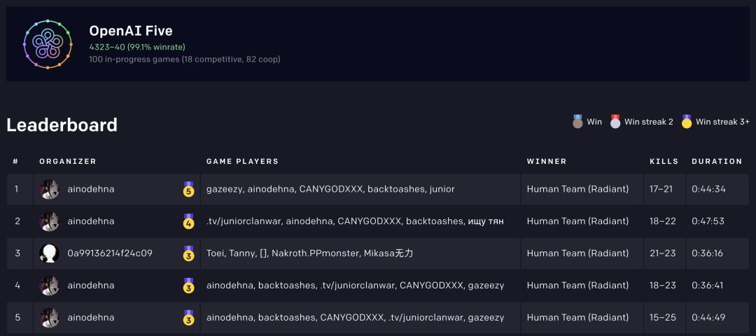 现在,三天时间过去了,比赛结果排行榜也在实时的发生着变化。从该排行榜来看,人类目前只赢了40场比赛,OpenAI Five的胜率高达99%!