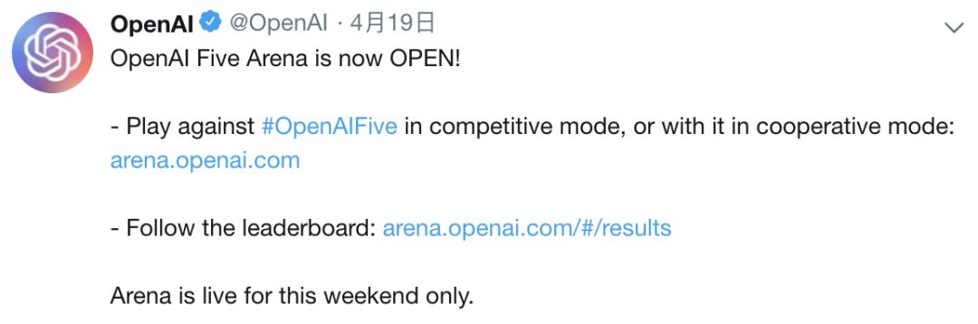 正所谓“U can U up”,OpenAI在赛后宣布4月18日开放一个名为OpenAI Five Arena的竞技场,人类玩家可以组团或者和AI组队打比赛。