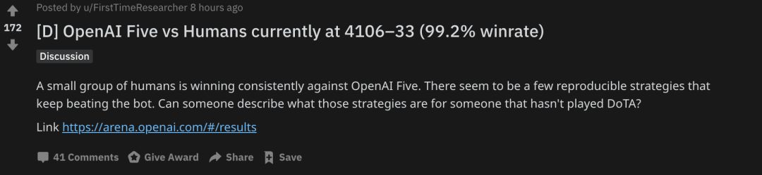 https://www.reddit.com/r/MachineLearning/comments/bfq8v9/d_openai_five_vs_humans_currently_at_410633_992/