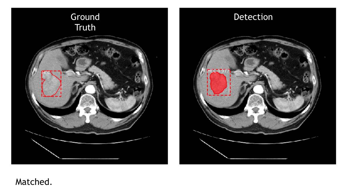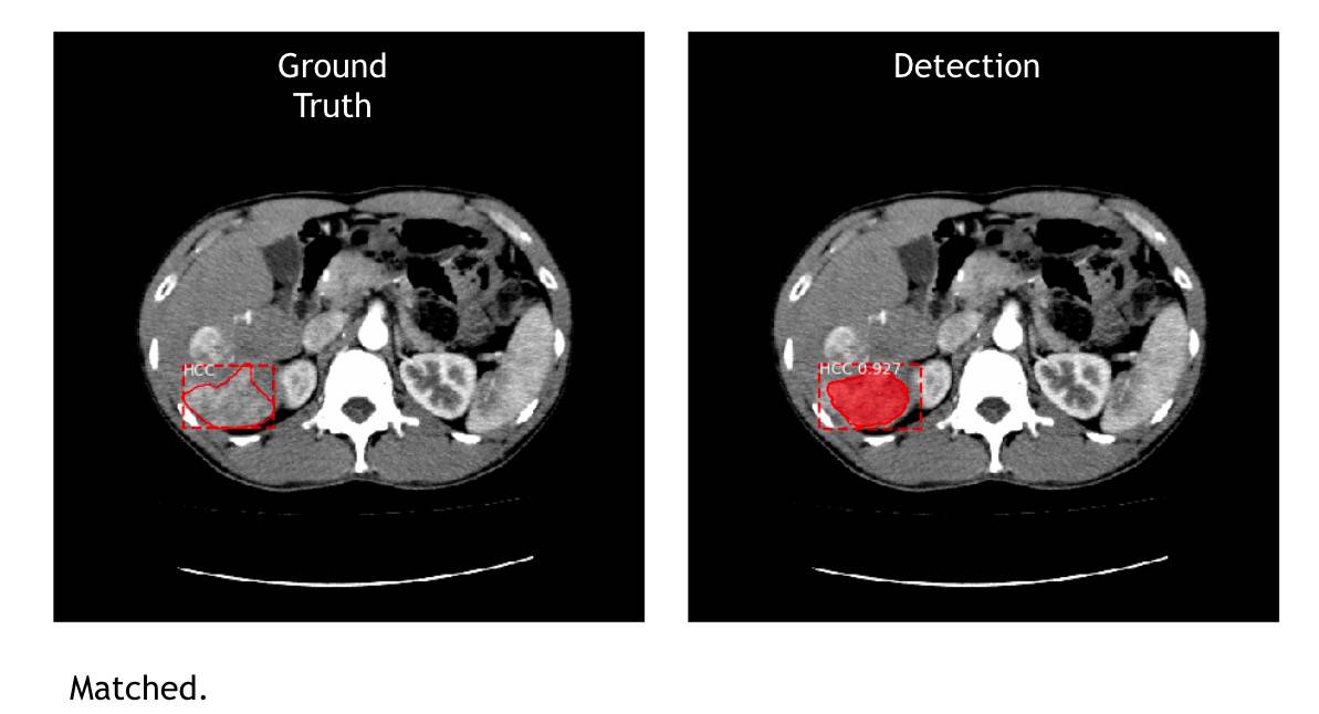 先用下方的肝脏 CT 图片来解释,左边 Ground Truth 图是传统的做法,就是医生看片子,把肿瘤的位置、大小框出来。右边 Detection 图是 AI 侦测的结果,上头显示 HCC(肝细胞癌 Hepatocellular Carcinoma,简称HCC) 0.977 ,数字指的是机器下判断的自信程度(与准确率无关,只是机器在做判断时对答案的自我评估)。
