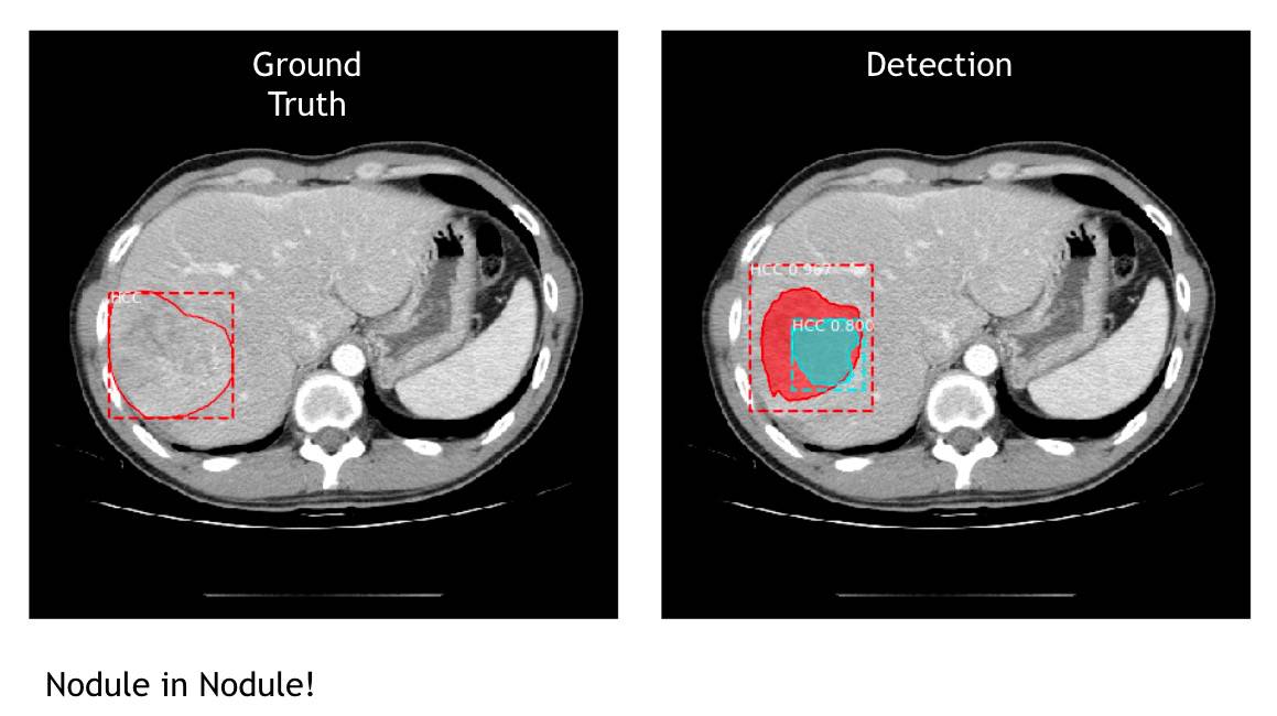 不仅 AI 可以找出肿瘤位置、框出边缘,甚至还出现惊喜,游家鑫指出有两个很特别的状况,一个是他们没有教机器 nodule in nodule 肿瘤中还有一个肿瘤这种低机率低的情况,但它自己找出来了,当初研究人员看到机器标这张图,还以为机器出错,就拿去请教医生,才知道原来这就是 nodule in nodule 。另一个就是有一张素材里有一个“人为标错”的状况,因为有时医生真的太疲累而画错,但机器却自己找出正确的肿瘤位置。