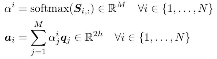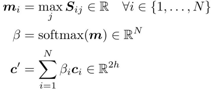 而对于Query2Context Attention,我们想要知道对于query,哪些context words与任意一个query words相似度较高,我们得到对于query来说最关键的context words的加权求和: