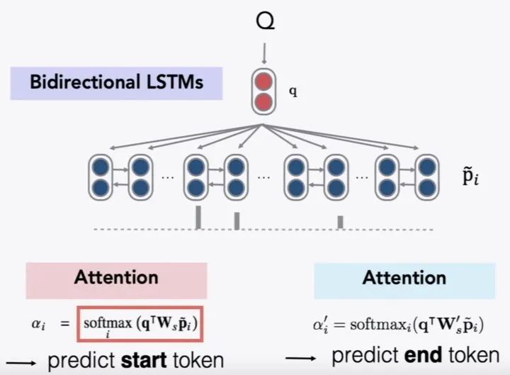 再对Passage中的每个单词进行Bidirectional LSTM提取其特征向量, 并对每个单词对应的特征向量与问题的特征向量进行Attention操作,分别得到推测答案起始位置与终止位置的attention score,损失函数为 。