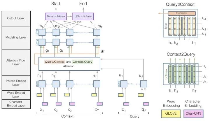 另一个比较重要的QA模型是BiDAF(Bi-Directional Attention Flow),其模型结构如下。