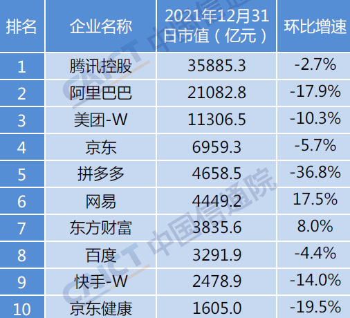 12月31日给2021年的资本市场画上了句号。中国前十大上市互联网公司,名单相比2020年并无太大变化,但市值加起来蒸发了近8000亿美金。