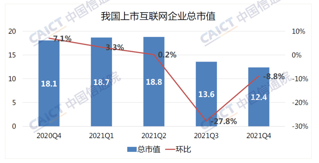 中国信息通信研究院的政策与经济研究所,发布的《2021年四季度中国互联网上市企业运行情况》,概述了近两年来中国互联网经济的态势。