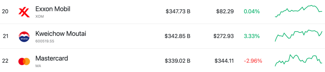 这个列表里,茅台也以3423.1亿美元的市值位列世界第21强,低于埃克森美孚,但高于运通卡公司。