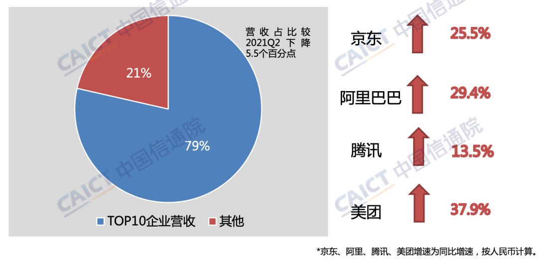 2021年底,中国Top10上市互联网企业营收占比为78.5%,营收增速为25%,高于上市互联网企业总营收增速。