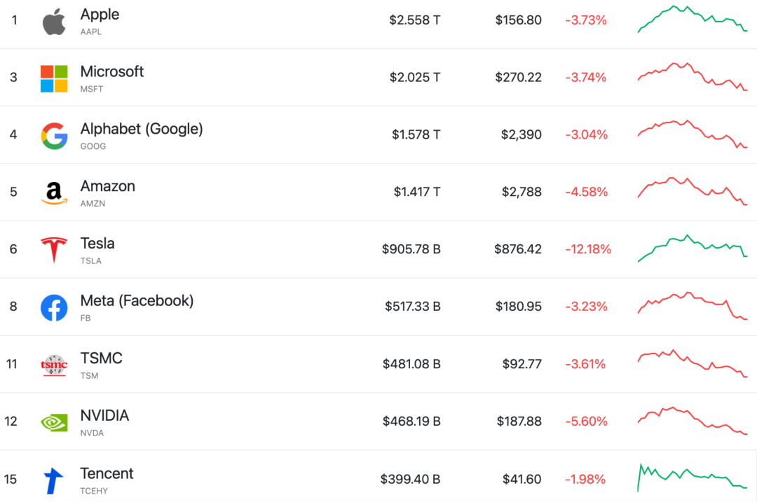 在2022年2月底的世界前十大市值公司排名中,苹果以2.8万亿美元的市值占当之无愧的第一。腾讯在这个排名中也有一席,以当时5898亿美元的市值占第十位。