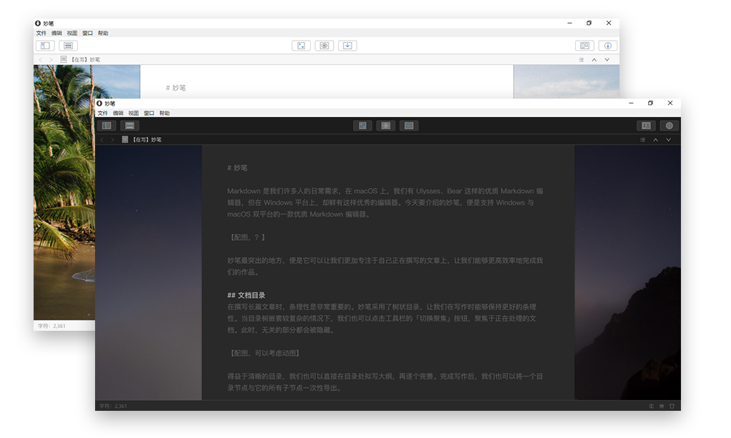 妙笔是你在 Windows 上进行 Markdown 写作的绝佳选择。不管你是写作爱好者还是专业作者,只要你平时有写作的需求,妙笔都能给你带来十分不错的体验。妙笔清晰的文档目录和聚焦模式能让你专注于当前的文字,它的备注功能也可以让你将素材管理得井井有条。