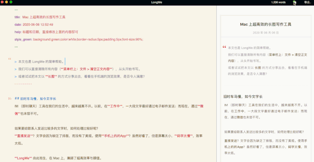 LongWe 是一款支持文字转长图的 Mac 应用,它可以帮你一键生成排版精美的长图,并分享到微信。由于应用是基于在 Markdown.app 开发的,因此除了能够高效导出图片外,LongWe 也拥有不俗的写作体验。