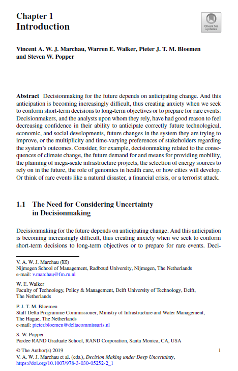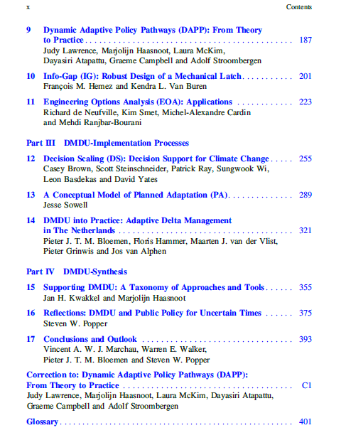 深度不确定性下的决策: 从理论到实践分为四个部分。第一部分介绍了在深度不确定性下设计策略计划的五种方法: 稳健决策、动态适应规划、动态适应策略路径、信息缺口决策理论和工程选项分析。每种方法都是根据其理论基础、使用方法时要遵循的方法学步骤、最新的方法学见解和改进的挑战来制定的。在第二部分中,将介绍每一种方法的应用。基于最近的案例研究,运用每种方法的实际意义被深入讨论。第三部分基于对真实世界案例的理解,重点关注在真实世界的环境中使用这些方法和工具。第四部分包含结论和综合可以为设计、应用和执行深度不确定性下的策略计划而得出的教训,以及对未来工作的建议。