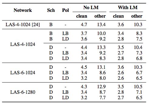 在下图中,“Sch”表示学习率的选取,“Pol”表示增强策略。可以看到,有6层LSTM和1280个词嵌入向量的LAS模型取得了最好的效果。