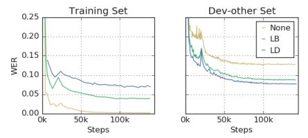 在他们的实验中,他们把这些方式整合在一起,并介绍了四种不同的整合方式,分别是:LibriSpeech basic (LB), LibriSpeech double (LD), Switchboard mild (SM) 和Switchboard strong (SS)。