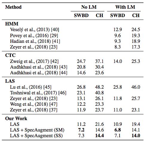 在300小时的Switchboard数据集上,选取四层LSTM的LAS模型作为基准,可以看到频谱增强对模型效果有明显的提升。