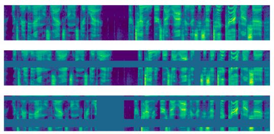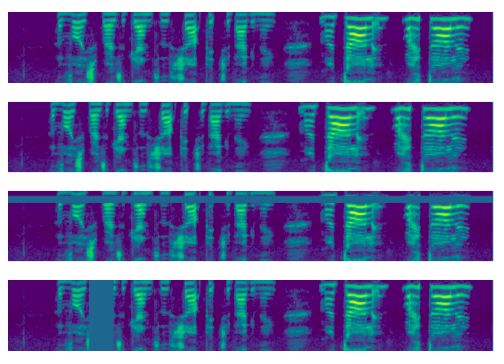 上图展示了对数梅尔频谱图的多种调整,从上到下分别是不做增强的原始图,时域调整,频谱覆盖以及时域覆盖。(Park et al., 2019)