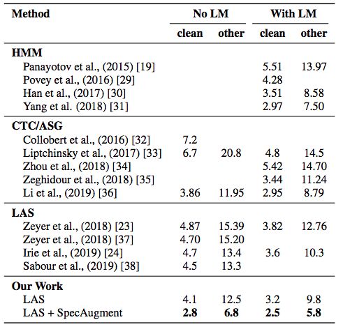 Park等人使用LAS结构来验证数据增强的效果,该结构包含两层卷积神经网络(CNN),一个注意力层(Attention)以及一个双向的长短期依赖(LSTMs)。 因为本文主要关注数据增强,模型只是验证增强效果的方法,如果你想深入的了解LAS,可以点击原文查看。