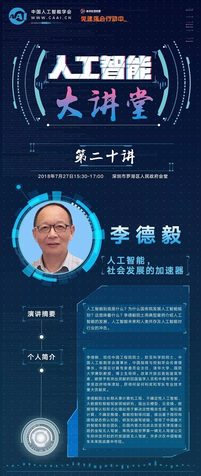 2018年7月27日,中国人工智能学会(CAAI)理事长、中国工程院李德毅院士将在深圳市罗湖区人民政府会堂为大家带来精彩的第二十讲。