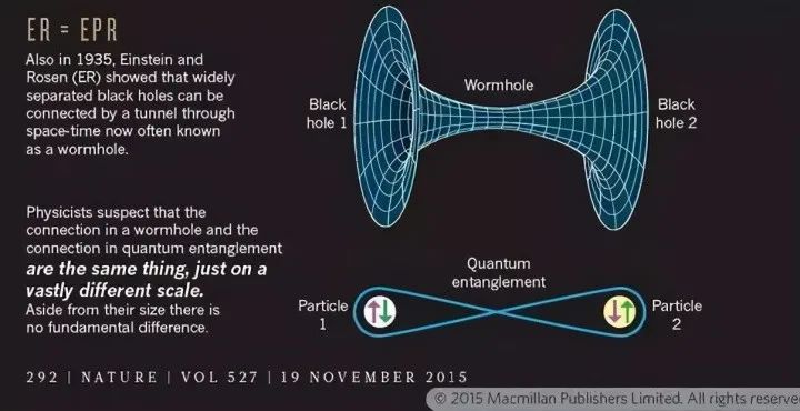 虫洞是广义相对论的产物。然而,广义相对论并没有告诉我们虫洞是如何产生的。于是,物理学家想到了利用规范/引力对偶将这一问题转移到量子的角度去分析。2013 年,物理学家马尔达西那与合作者萨斯坎德(Leonard Susskind, 1940–)发表了一篇论文。他们发现,与虫洞相对应的量子现象正是我们早已为之困扰了很久的