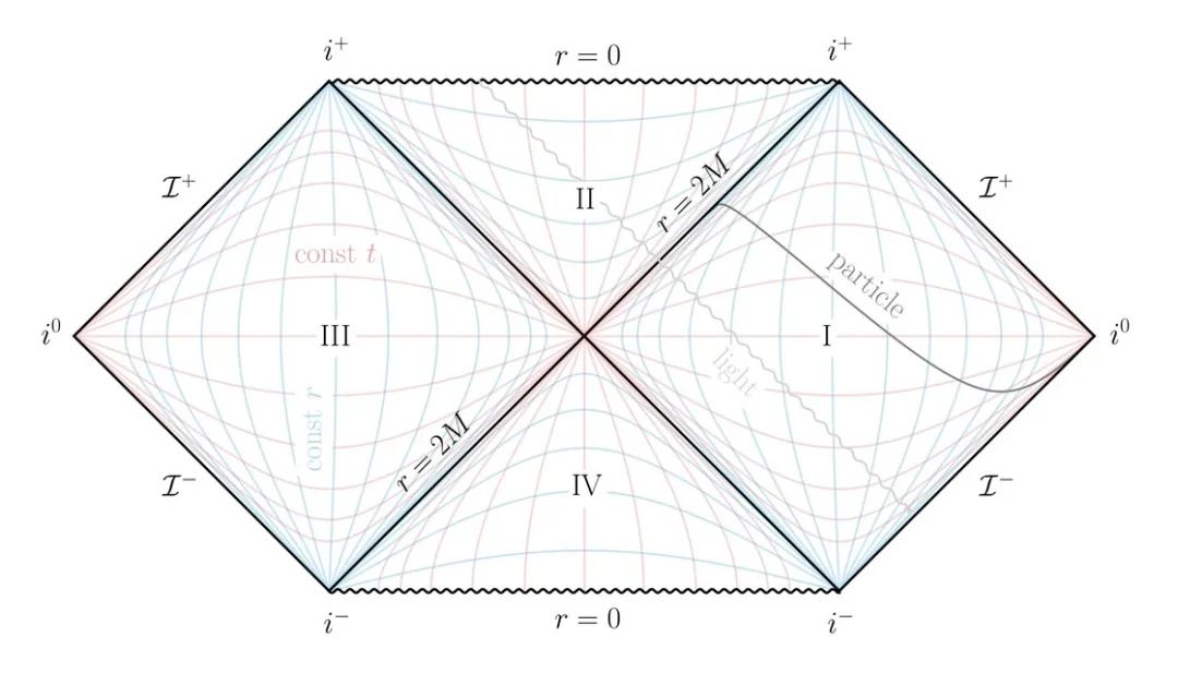 1960 年,克鲁斯卡尔(Martin Kruskal, 1925–2006)将史瓦西解进行了拓展,构造了所谓的克鲁斯卡尔延拓,大概是图 2 那个样子。图 2 中右侧用罗马数字 I 标记出来的菱形区域是黑洞以外的宇宙,而上方用罗马数字 II 标记的倒三角区域便是一个黑洞。除此之外,克鲁斯卡尔延拓还包含了两个镜像的区域:区域 III 是一个镜像的宇宙,而区域 IV 便是黑洞的镜像,我们称之为