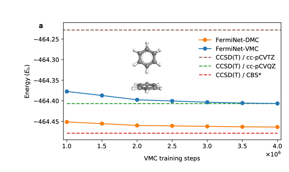 [2] Pfau, D., Spencer, J. S., Matthews, A. G., & Foulkes, W. M. C. (2020). Ab initio solution of the many-electron Schrödinger equation with deep neural networks. Physical Review Research, 2 (3), 033429.