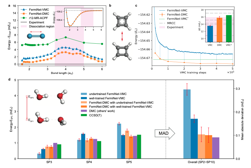 作者将基于神经网络的试探波函数运用于固定节点面的扩散蒙特卡洛方法 (Diffusion Monte Carlo, or DMC) ,用以精确计算具有不同电子特性的原子以及分子系统。