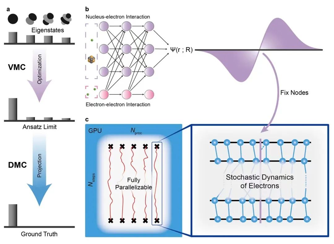 扩散蒙特卡洛方法是量子化学领域精确计算分子和材料基态能量的常用方法之一。通过与扩散蒙特卡洛方法结合,作者显著提高了量子化学中神经网络 SOTA 方法的计算精度与效率。此外作者还提出了一种基于经验线性关系的外推方法,大幅改善了分子结合能计算。总体而言,该计算框架作为求解量子多体问题的高精度方法,为化学分子性质的深入理解提供了更强大的工具。