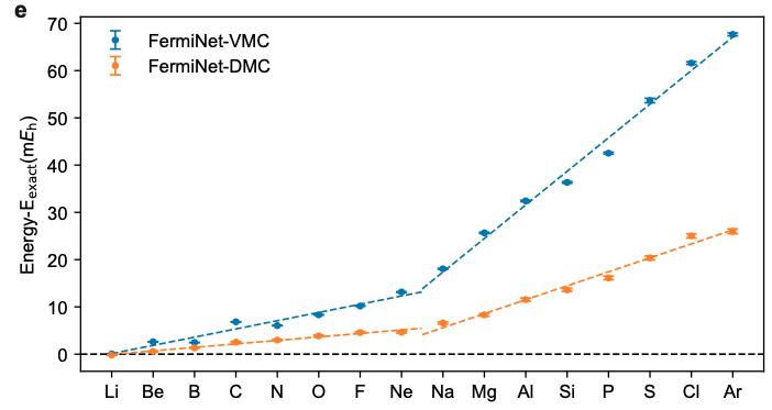 2018 年以来,多个研究小组将神经网络运用于变分蒙特卡洛方法 (Variational Monte Carlo, or VMC) 中 [1,2,3],借助神经网络强大的表达能力,得到了更为精确的分子基态能量。本工作于 2022 年公开时,基于神经网络的变分蒙特卡洛方法中的 SOTA 工作是 DeepMind 于 2019 年提出的 FermiNet [2],能够在规模较小的体系上得到非常精确的结果。然而变分蒙特卡洛方法的精度受限于神经网络的表达能力,在处理较大体系时会有越来越明显的精度问题。此外该类方法在处理较大体系时收敛非常缓慢,对计算资源提出了巨大挑战。