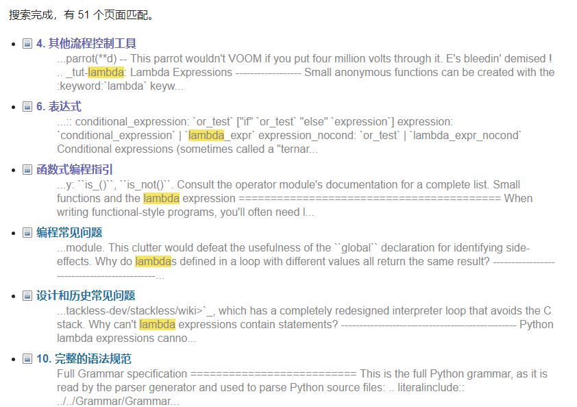 可能对大多数开发者而言,检索 Python 的函数或用法是文档的常用方法。例如如果我们希望找到函数式编程的使用方法,那么可以在中文文档中搜索 Lambda: